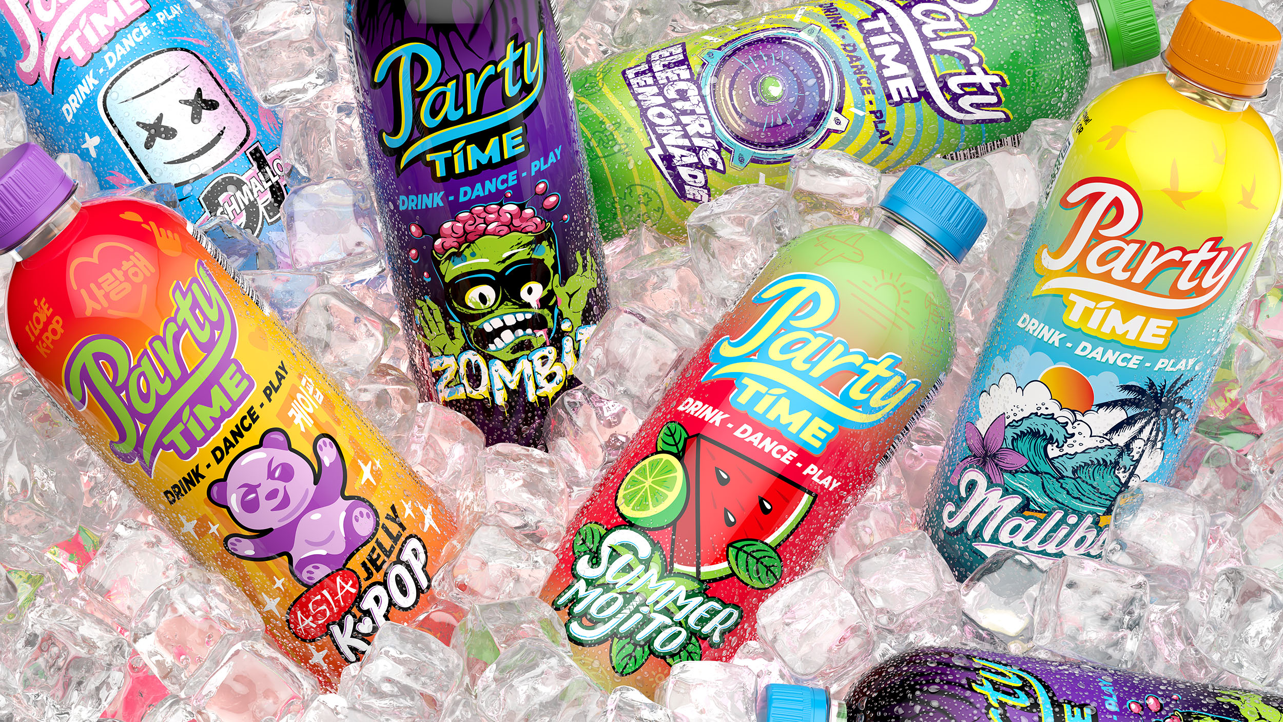 Команда CUBA Branding и один из лидеров по производству безалкогольных напитков в России Компания Росинка представляет новинку 2025 года — линейку лимонадов Party Time, разработанную специально для ценителей ярких вкусов и незабываемых моментов! Освежающие напитки Party Time станут идеальным акцентом на любом мероприятии — будь то дружеская вечеринка, семейный пикник или просто момент, когда хочется добавить ярких красок в повседневность. Линейка представлена шестью уникальными вкусами: Asia Jelly K-Pop, Summer Mojito, DJ Marshmallow, Zombie, Electric Lemonade и Malibu.